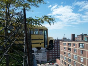She suggested we start our visit on the roof, and I wasn’t surprised that she was right. Sam headed straight into the driver’s seat of the school bus that’s attached to the roof so that the front half of it is actually sticking out past the edge and hovering precariously 10 stories over the sidewalk.