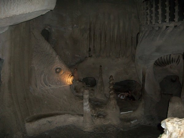 At the bottom the slide dumps you into a hunormous, two-story-high room called the Enchanted Caves: a series of caves and tunnels so elaborate there was no way to adequately photograph or even describe it. The room was very dimly lit, the tunnels were even darker, and there were dozens and dozens of them intertwining and leading to more tunnels and new areas and eventually somehow back into the center of the room,which was full of stalactites and stalagmites and carved with various large creatures including fish, panthers, and an enormous dragon with glowing eyes.