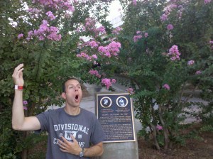 On the way out of town we made one more quick stop so ridiculous that it made a visit to Colonel Sanders’ grave seem necessary by comparison. Under an overpass for Interstate 64 is a public pay parking lot, outside of which sits a small plaque. The plaque commemorates the origin of the song “Happy Birthday to You, ” which was written in Louisville by two women. Yes, it took two people to write a song that has four words. Why the plaque is in that exact spot I’m not sure, and the plaque itself doesn’t say. But that didn’t stop me from paying tribute to the 19th-century songwriting duo by singing their classic in front of their plaque. Sam was not amused but I made him take a picture of the event anyway.