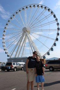 Anyway, shabbos was spent reconnecting, eating very well, relaxing by the beach, futilely looking for Sam’s goggles, and enjoying the hotel pool, which included two sprinkler areas, a two-story water slide, and a lazy river. This seemed pretty amazing to us at first but it appears to be de rigeur for Myrtle Beach hotels. Myrtle Beach strikes me as a kind of gentrified Coney Island, but one that’s meant more for tourists than for locals. It seems like every building that’s anywhere near the beach is either a place for tourists to stay or a place for tourists to spend some time and money. Beachfront hotels are tall and narrow so more of them can squeeze in, and the blocks immediately behind them are filled in with carnival rides and games, bars, restaurants, souvenir shops, minigolf, and the aforementioned beachwear stores. Sometimes a couple of these places are combined into one. The beach, like everything else here, is crowded but pretty nice and open late into the night.