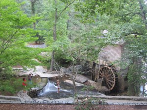 Eventually the rain did subside, the sun came back out, and by the time we arrived at Stone Mountain Park there was no trace of the storm. Before we headed to see the mountain carving we decided to take advantage of the newly beautiful weather and have dinner. On the recommendation of the parking attendant at the entrance, we found a quiet picnic area next to a grist mill and waterfall that provided both a place to grill and a great view while we ate.