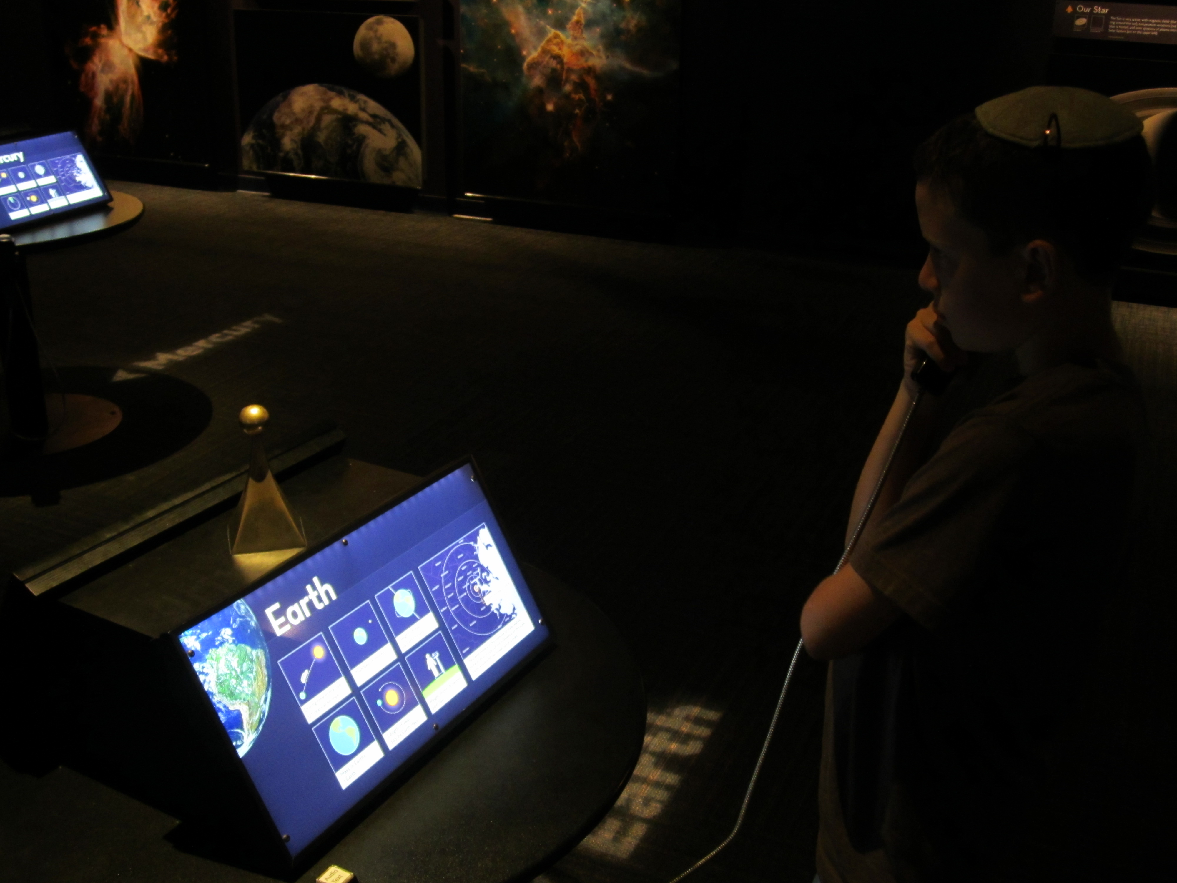 Next up was Boston, where we’ll be through the weekend. Boston was tough to plan for because I’ve taken Sam there before so the major sights and activities (Boston Common, the Public Garden, the swan boats, the Freedom Trail) have already been seen and done. So we’re doing a few quirkier things this time, and tonight’s activity was an IMAX movie on a giant dome-shaped screen at the Museum of Science. It took us forever to get there, and Sam spent the drive watching Hoosiers on the portable DVD player. I will admit that when he got up to the famous locker room pep talk scene I took my hands off the steering wheel to join in the slow clap. Anyway, we eventually made it to the museum in time for a 6pm showing of a pretty good movie about the construction of the Canadian Pacific Railroad through the “Rockies,” which we assumed meant the beaches in Cape Cod. It seemed like an odd subject matter for a Boston museum but the Hamster and I both hold the position that trains are awesome, so we loved it. And in the few minutes we spent waiting around for the movie to start, Sam got to explore an exhibit about planets and have a telephone conversation with planet Earth (you know, the third rock from the sun).