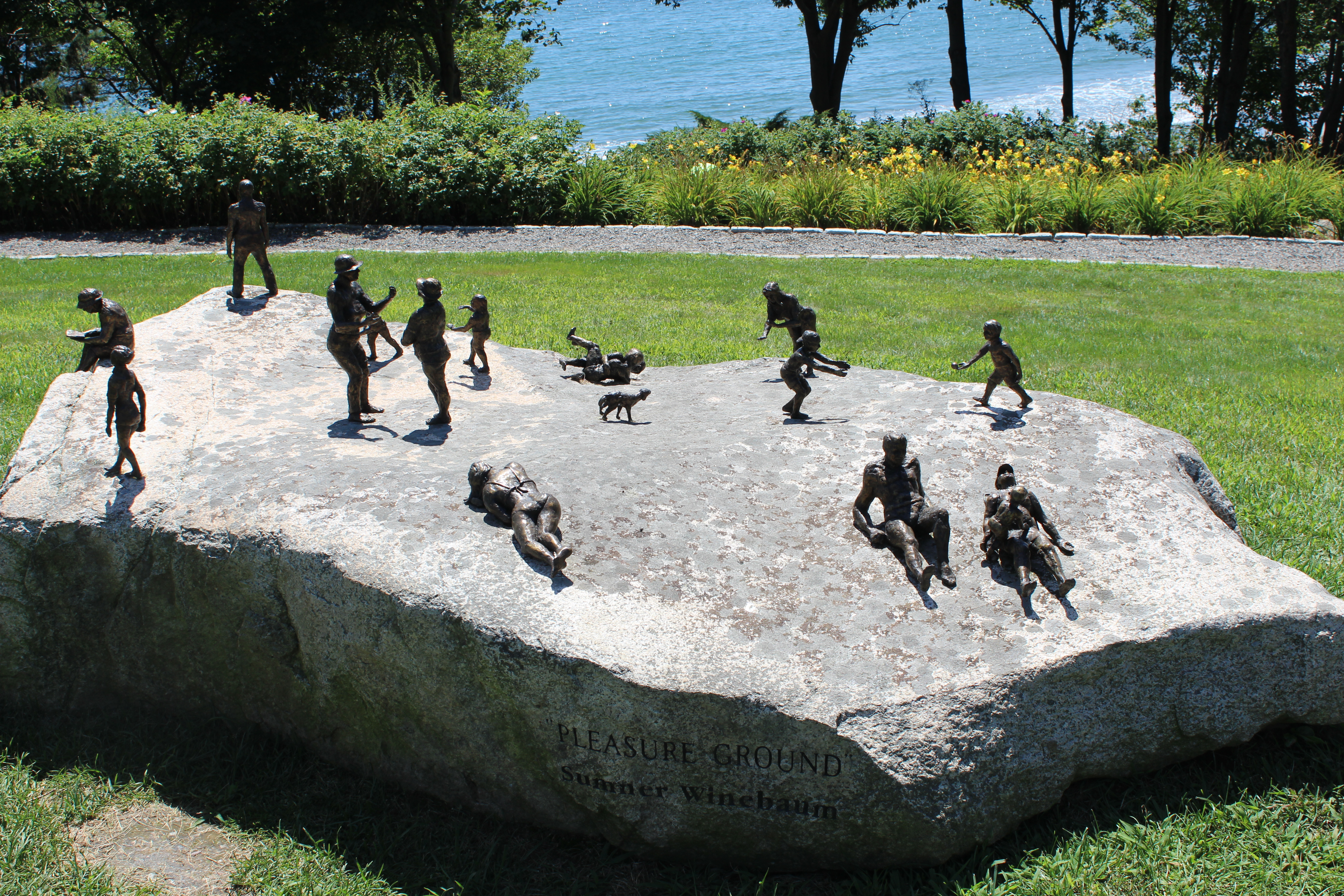 The submarine tour went quickly so we were right back on schedule for the day, which gave us time to make a fun little stop on our way up north. Soon after we crossed into Maine (state #44 for me, 41 for Sam), we stopped for a few minutes at a small public park in York Harbor called the Hartley Mason Reservation, after a dead guy who left money and land to the town under the condition that they permanently turn it into a public “pleasure ground.” Located on a hill, it’s a beautiful little park with bright green grass, colorful flowers, and stunning views of the ocean and beach below. But the reason we wanted to visit (aside from it being directly on our way) was a sculpture, roughly four feet wide, of … people playing in a park.
