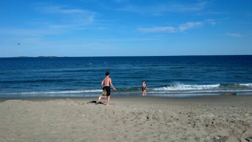 The beach at Old Orchard Beach turned out to be exactly the beach we’ve been looking for all along. Plenty of soft sand, some waves, no rocks, and water that was reasonably clear and not terribly cold. Better still was our timing; by the time we got there the lifeguard was gone but so were most of the people, and we had plenty of room to spread out and enjoy ourselves.