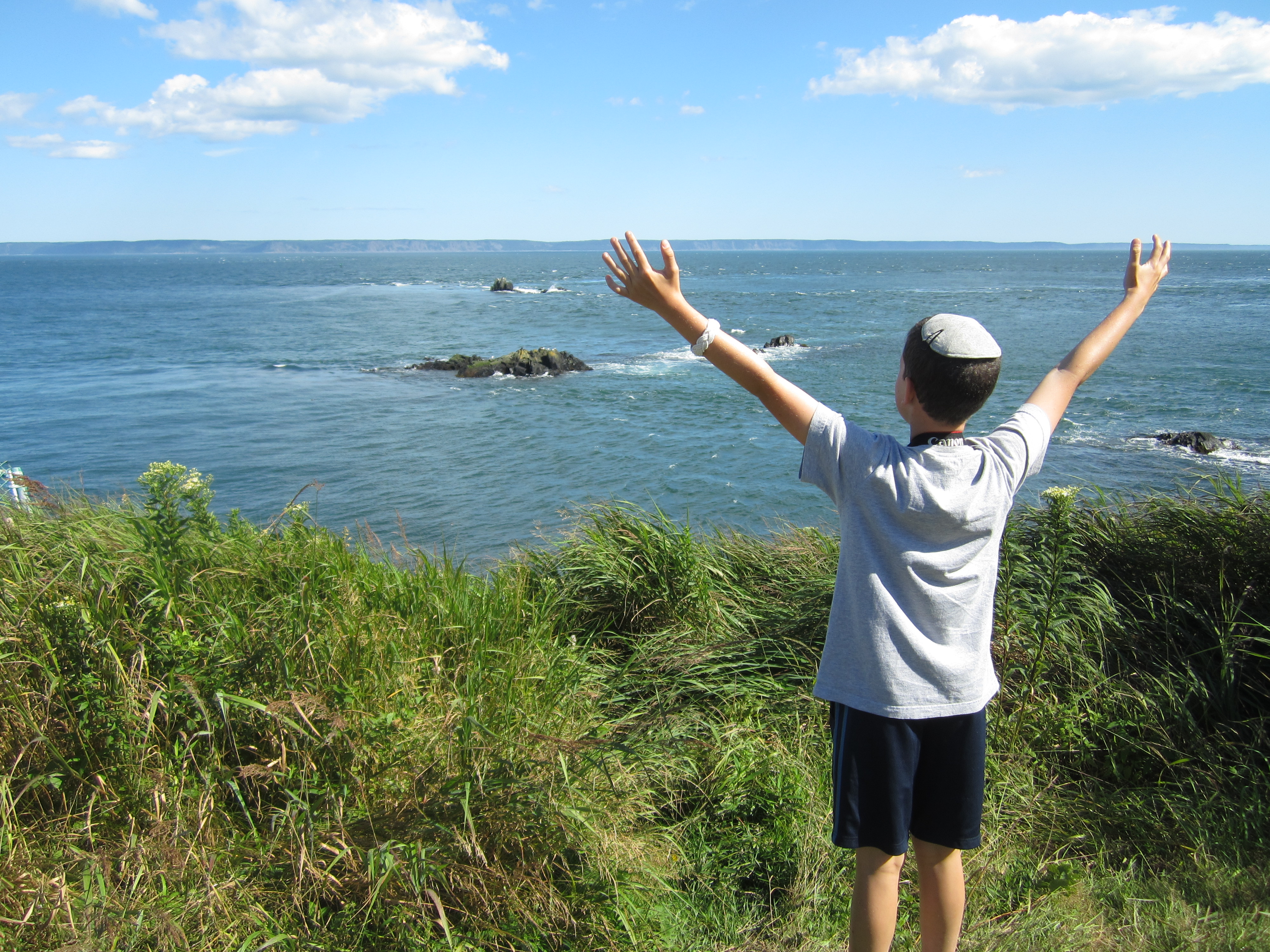 Yup. Canada. The Hamster and I have been semi-obsessed with the Bay of Fundy ever since he learned about Canada in depth in fifth grade. Forty-foot tidal flows! Crazy rock formations! We were planning to see a bit this evening and then some more tomorrow, but I forgot we’d be losing an hour when we crossed into New Brunswick (they’re on Atlantic time, which is an hour ahead of Eastern time), so by the time we checked into our motel in Saint John, NB, it was about 7:30 and both sun and son were starting to fade.