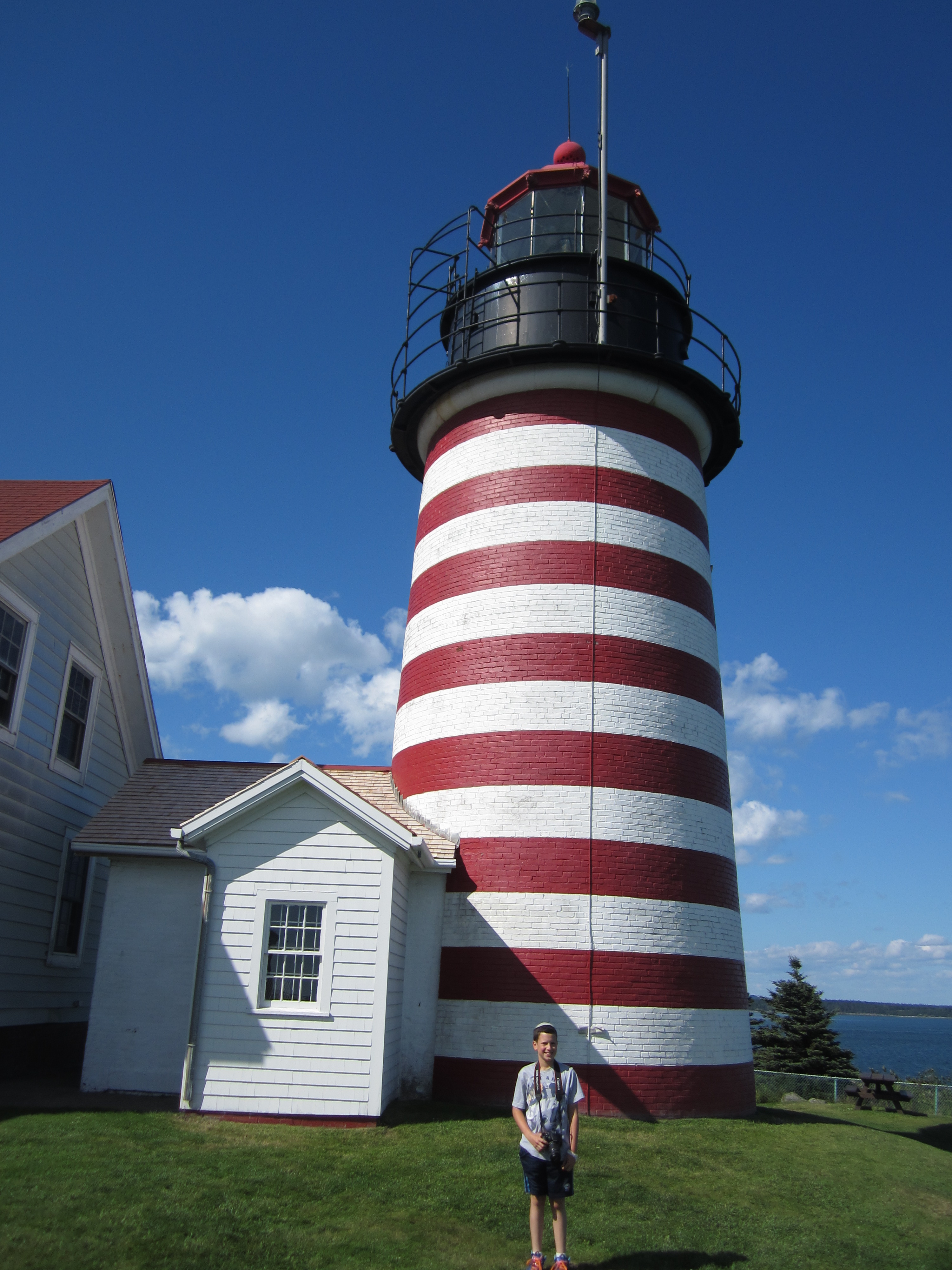 Once we were done with the falls there was nothing between us and our journey to the utter east. Maine, obviously, is the easternmost state in the U.S. Lubec is the easternmost town in the state. Quoddy Head State Park is the easternmost part of Lubec. The easternmost tip of the park, therefore, is the easternmost tip of the contiguous United States. Standing at that tip is the West Quoddy Head Light, an iconic lighthouse painted with wide, horizontal red and white stripes. We love lighthouses and we love extremes and superlatives, so this was a natural for us.