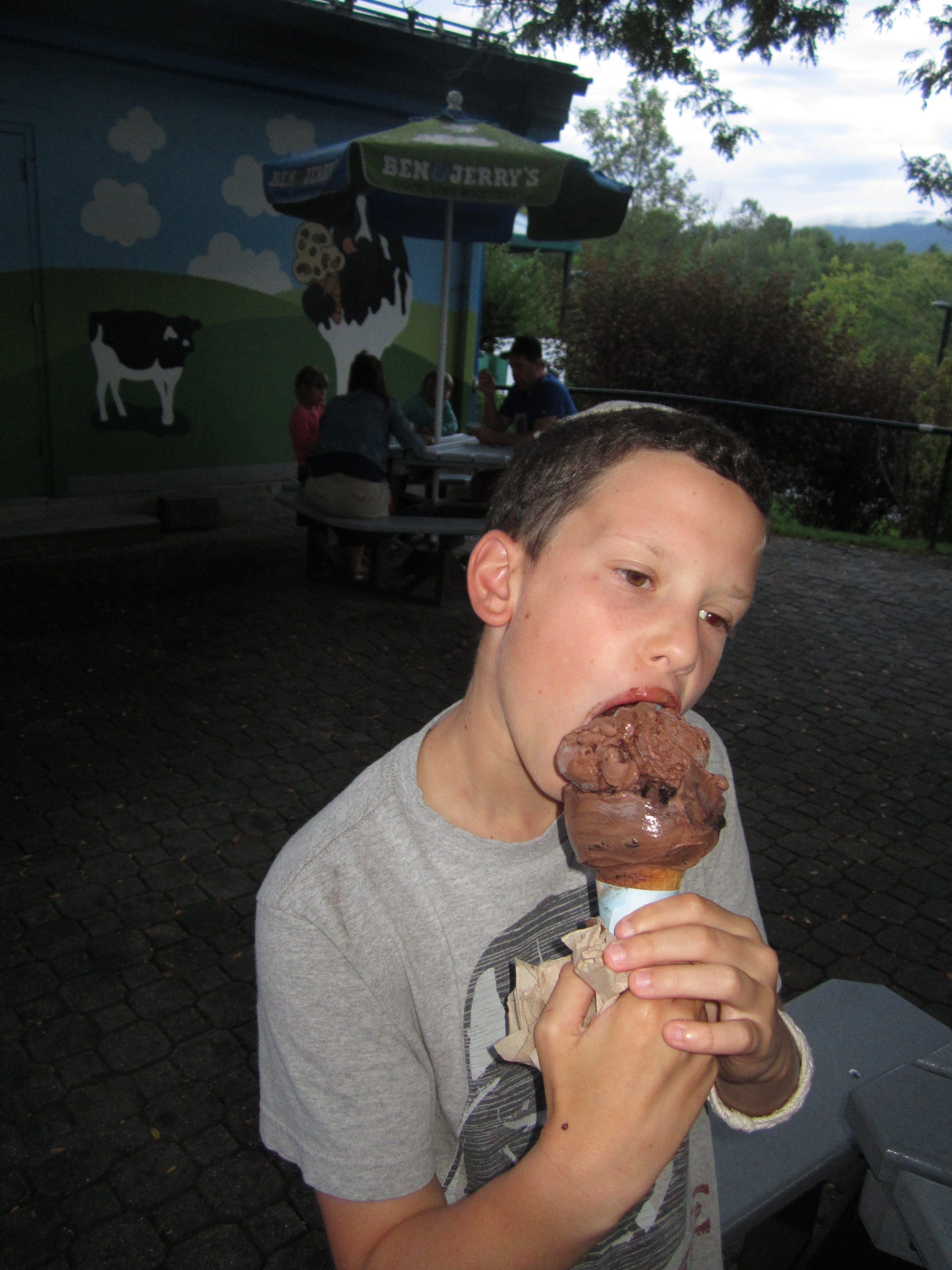 By this time it was close to 8:00, and we still hadn’t had dinner. We were planning to find a place to grill burgers, but it was getting dark and it was still drizzling, and Vermont is so small that there are not a lot of rest stops along the highways. I had an idea. I took Sam to the Ben & Jerry’s ice cream stand that’s right next to the entrance to the factory tours, and suggested that we each get a big cone and call it dinner. He agreed. I had a scoop of Late Night Snack topped with a scoop of Chunky Monkey, and Sam had a scoop of Chocolate Therapy topped with a scoop of Chocolate Fudge Chunk.