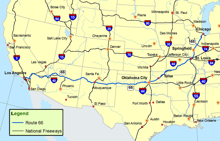 Of course, there were a few problems with this idea. For starters, driving through the southwest on Route 66 didn’t go very well for the Joad family. But that was almost 100 years ago, and also the Joads are not real. Problem solved. Another challenge was that Route 66 is a ridiculously long road–as the song says, “it winds from Chicago to L.A.” We could just drive part of it, as millions of travelers before us had. But I don’t like to do things halfway, so we decided that if we were doing it at all we were doing it completely. And finally, how on earth do we get back from Los Angeles? It would be boring to go back the way we came, but we’ve seen so much of the country that other routes would be equally boring. I looked into taking one of those auto trains where you drive your car onto a train, ride the train, and then drive off when you reach the destination. But it turns out there’s only one such train in existence currently, and it goes from Virginia to Florida, which is entirely unhelpful. Another option was flying back from California and having our car shipped back, but that’s pretty expensive, and, well, then we don’t get to do and see more stuff on the way home. Ultimately I solved the problem by plotting a more southern route home that is not quite as direct but brings us mostly through places we haven’t seen.