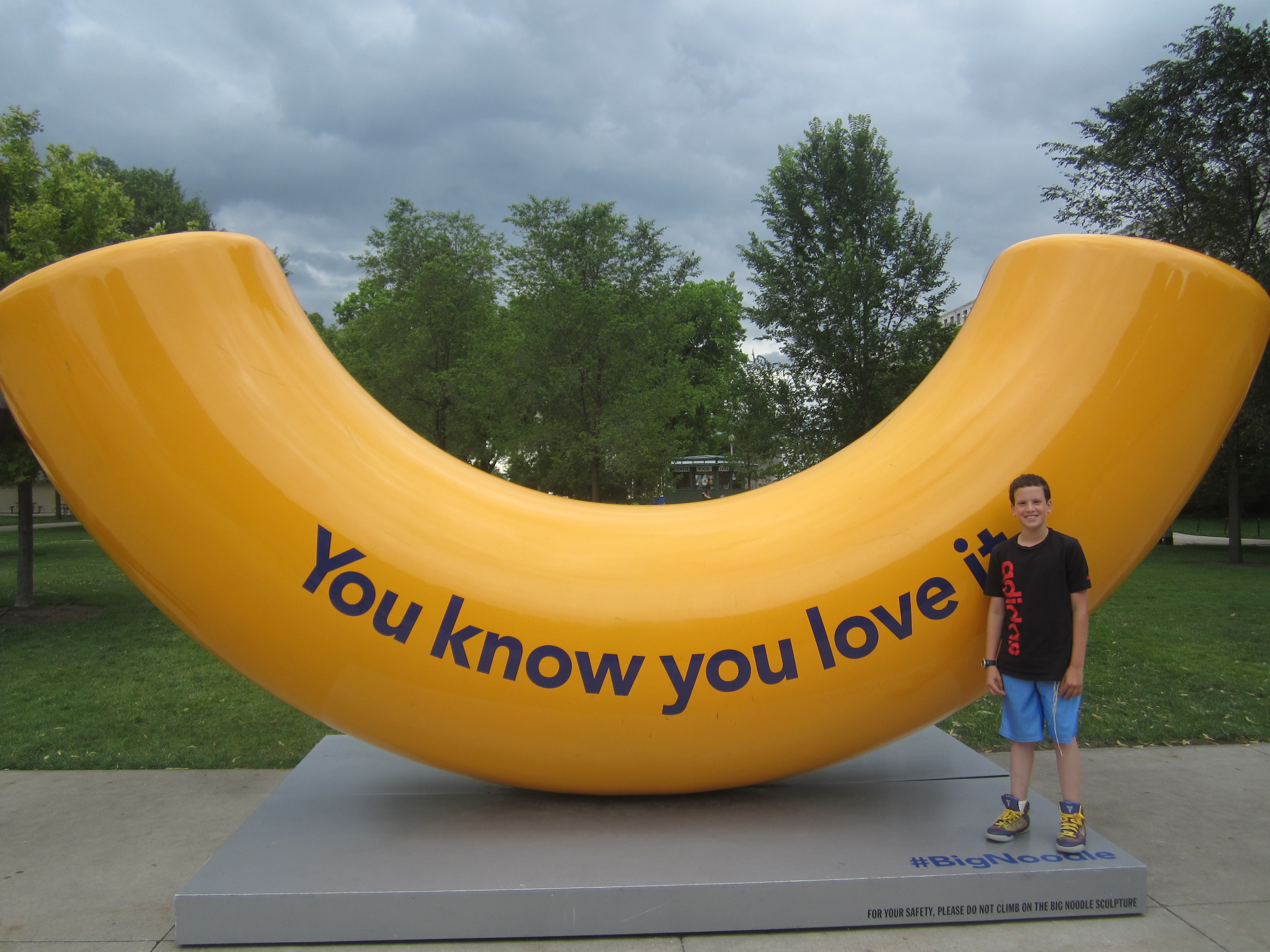It took a while to fight the traffic, and by the time we got there and parked it was a little after 5 pm. The aquarium closed at 6, which didn’t give us a lot of time but I figured we’d just get as far as we could before we got kicked out. First Sam needed to pee, and instead of waiting to do so inside the aquarium he insisted on stopping at a cafe next door to the aquarium to pee there. I’m not sure exactly how long it took, but I do know that we walked up to the ticket counter in the aquarium at 5:19, only to be told that the last entry was at 5:15. We were pretty frustrated and the situation instantly reminded me of the day on last year’s road trip when Sam’s dilly-dallying made us just a couple of minutes too late to go to the top of Pilgrim’s Tower in Provincetown. But this time we recovered quickly and took some time to enjoy the great views of the lake and the skyline. We also found some interesting statues nearby–especially this one of a giant piece of mac-and-cheese: