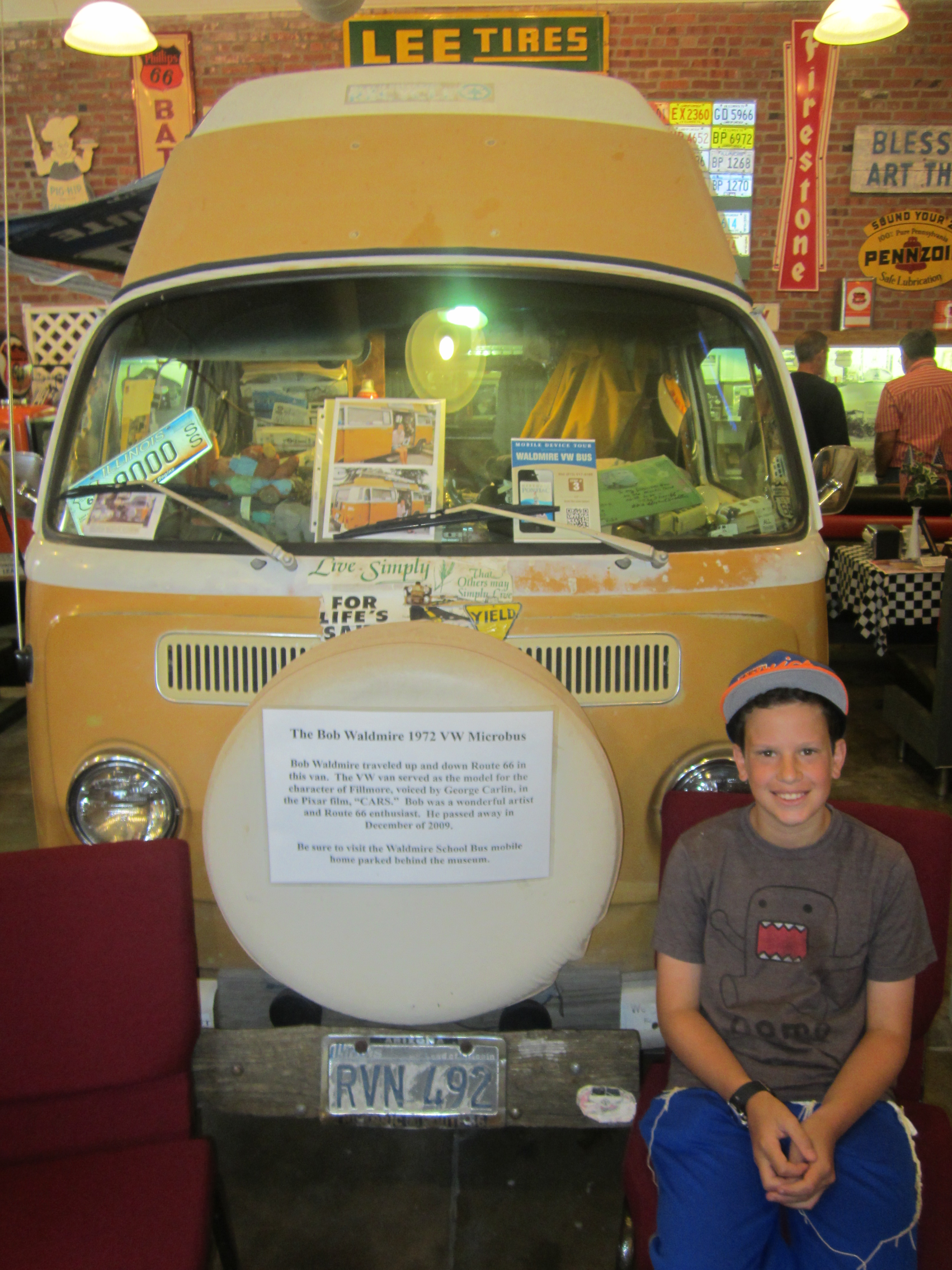 Eventually we found ourselves in Pontiac, IL, which is an adorable town that’s pretty obsessed with Route 66. It boasts the largest Route 66 shield, which is part of the big mural pictured at the top of this post. It’s painted on the back of the building that houses the Route 66 Hall of Fame and Museum. Oddly, there are several Route 66 Halls of Fame and/or Museums throughout the road’s eight states, and I assume they’re all pretty much like the one in Pontiac: small, cute, well-meaning, and not all that interesting. By far the best part of the museum was the VW minibus whose owner drove it across Route 66 repeatedly, and which served as the inspiration for the character Fillmore in Cars.
