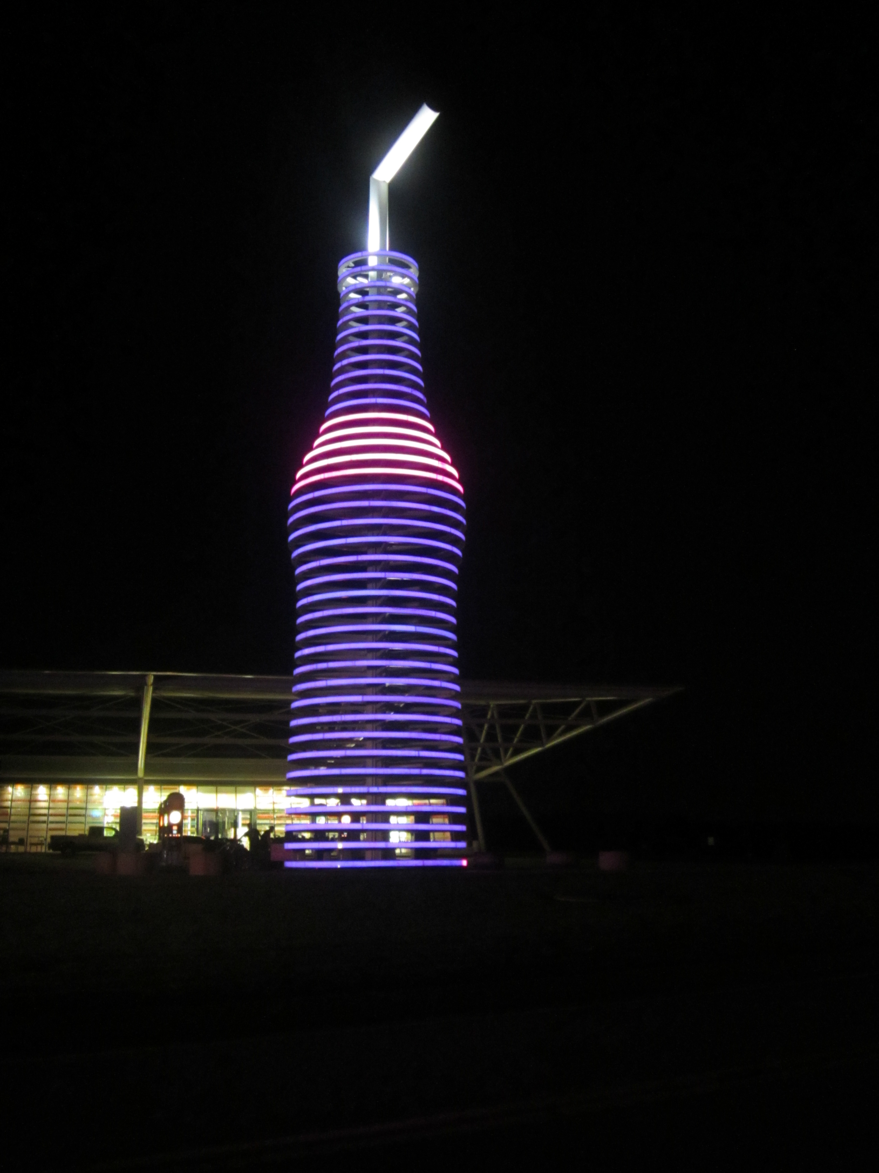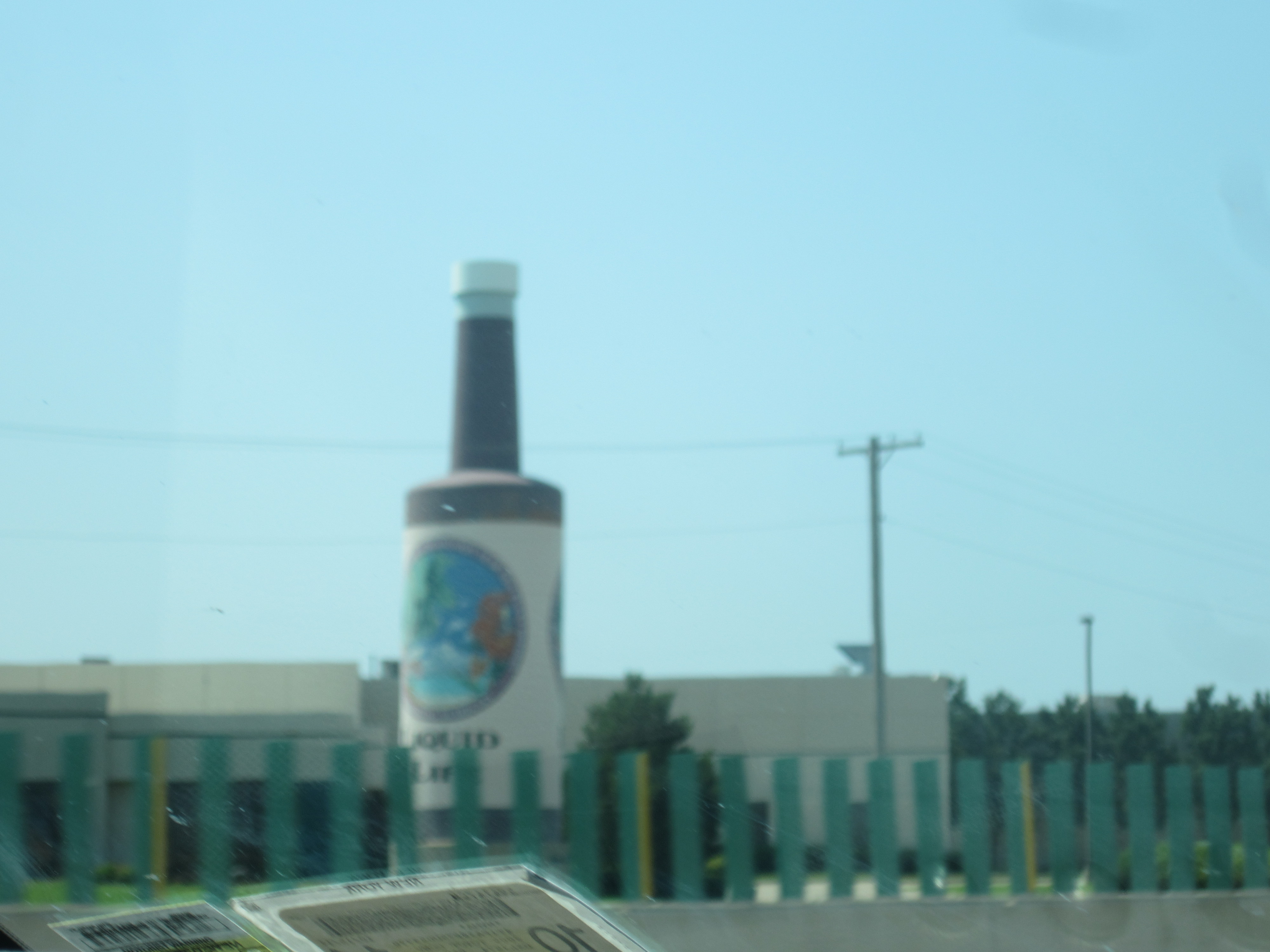 At 10:30 we began the drive to Oklahoma City. Sam fell asleep a little after 11, and by doing so he missed our final roadside sight of the day: a giant neon soda bottle right along Route 66. The bottle is—you guessed it—66 feet tall and lights up in color-changing rings. Nobody else was on the road, so I pulled over to snap a quick photo.
