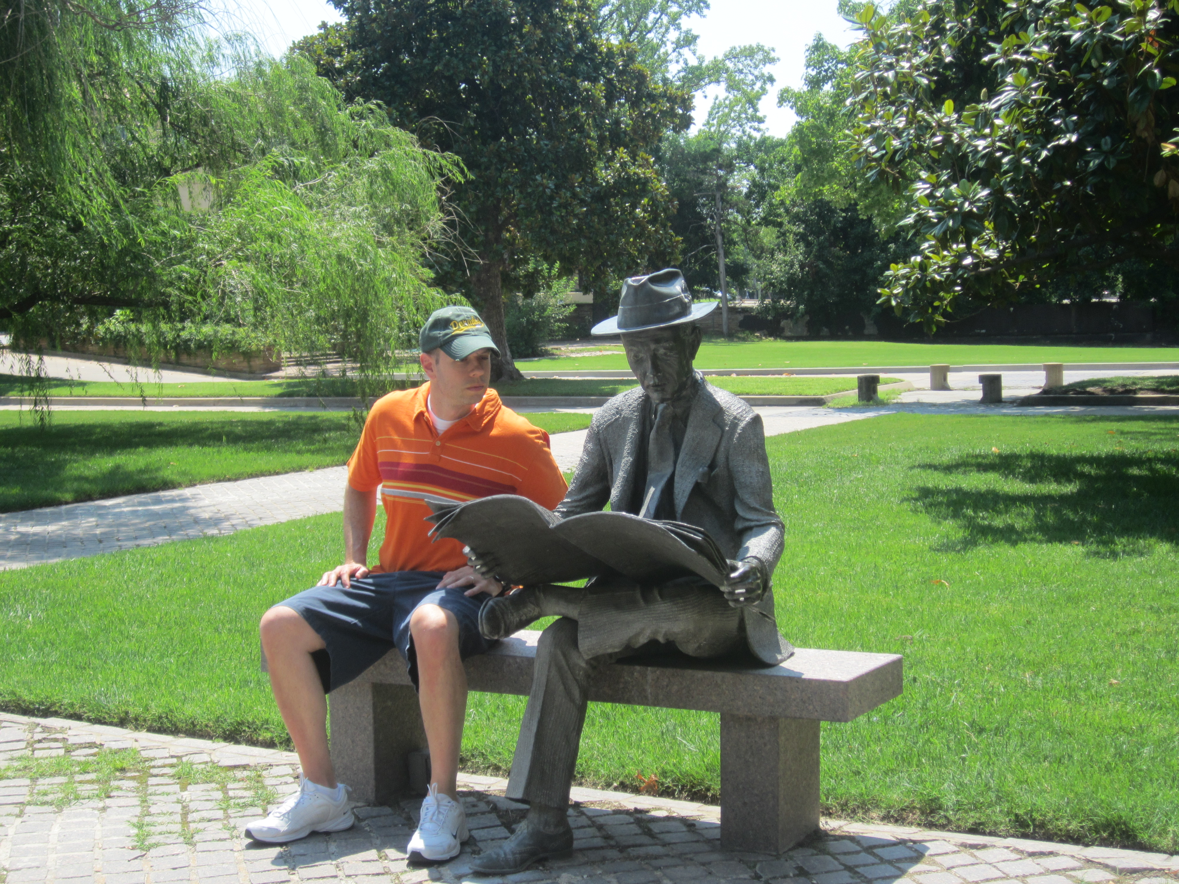 Eventually I dragged him out of the RV show and we continued to visit and pass odd and interesting sights around the city, most notably an extremely detailed statue of former Tulsa businessman Hans Helmerich sitting on a park bench and reading a copy of the Tulsa Daily World newspaper.