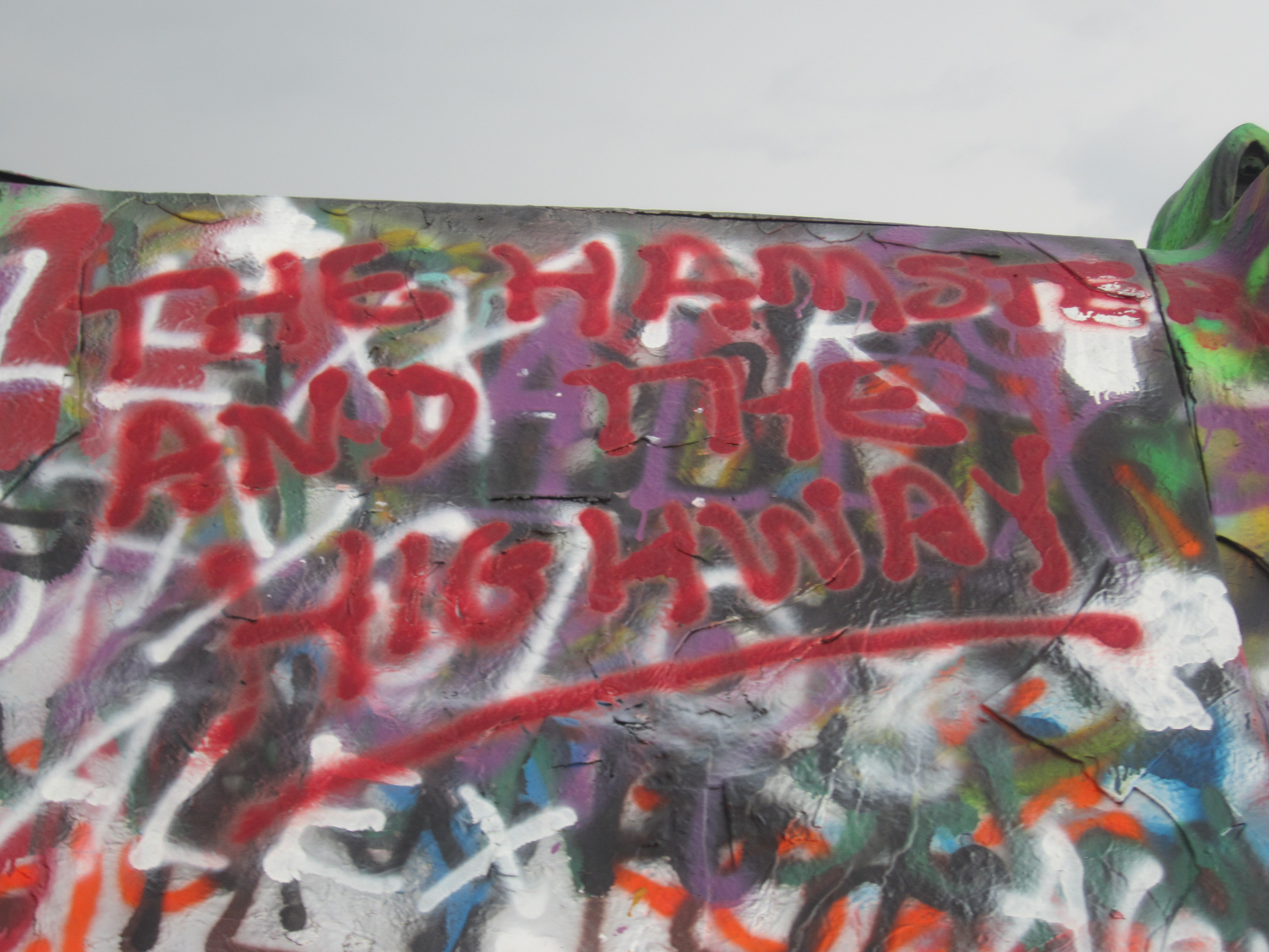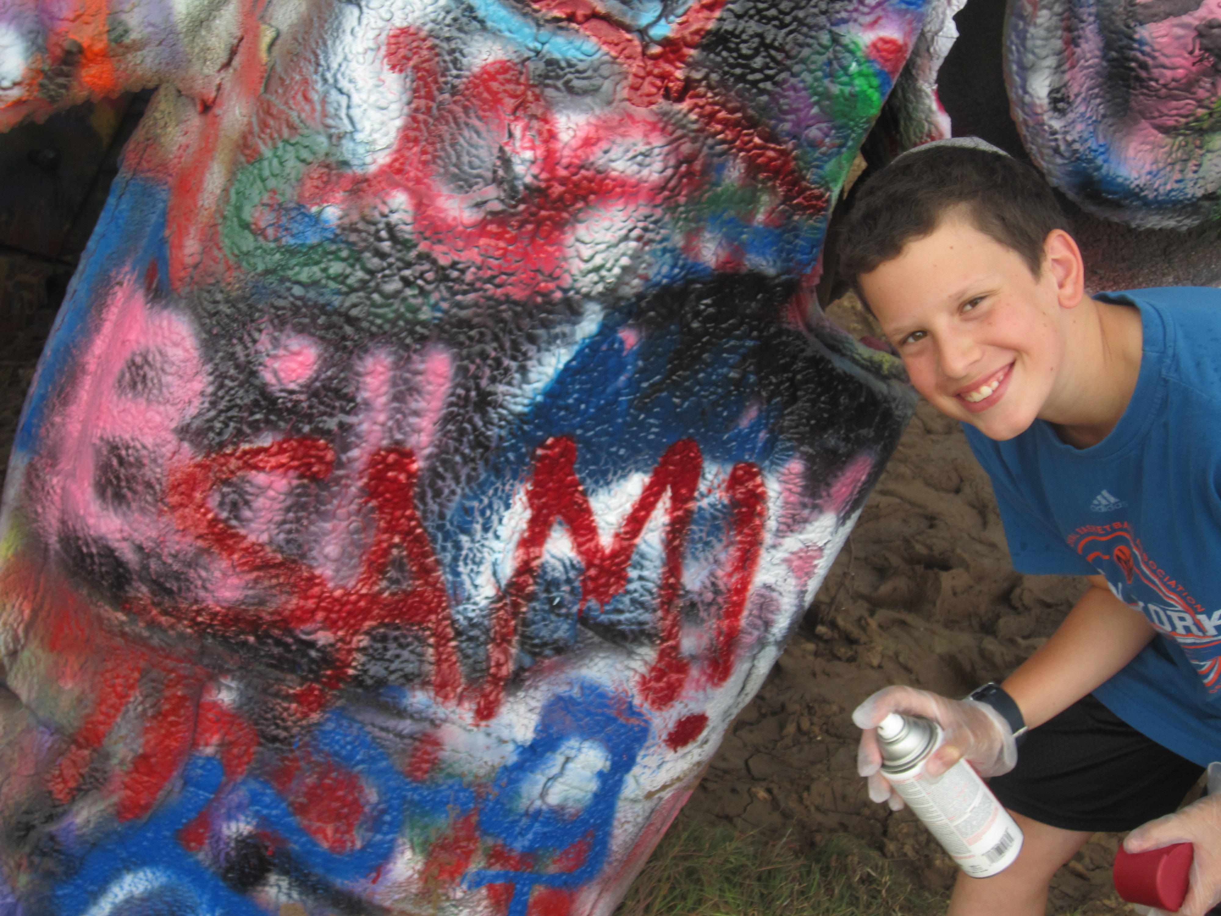 But back to those giant legs for a second–you probably noticed the graffiti. Well that’s nothing compared to what I’m about to show you. The main attraction in Amarillo is Cadillac Ranch, a row of 10 vintage Cadillacs with their noses buried into the ground at the same precise angle. It too, is behind a gate on private property, but the owner, a local millionaire (and possible sexual predator) who died just last month, encourages not just tresspassing but participation. Some people come to look at the cars, but most people bring a can or two of spray paint and “decorate” the cars. Over the years the cars have been stripped to their frames but as you can see there’s still plenty of room for painting.