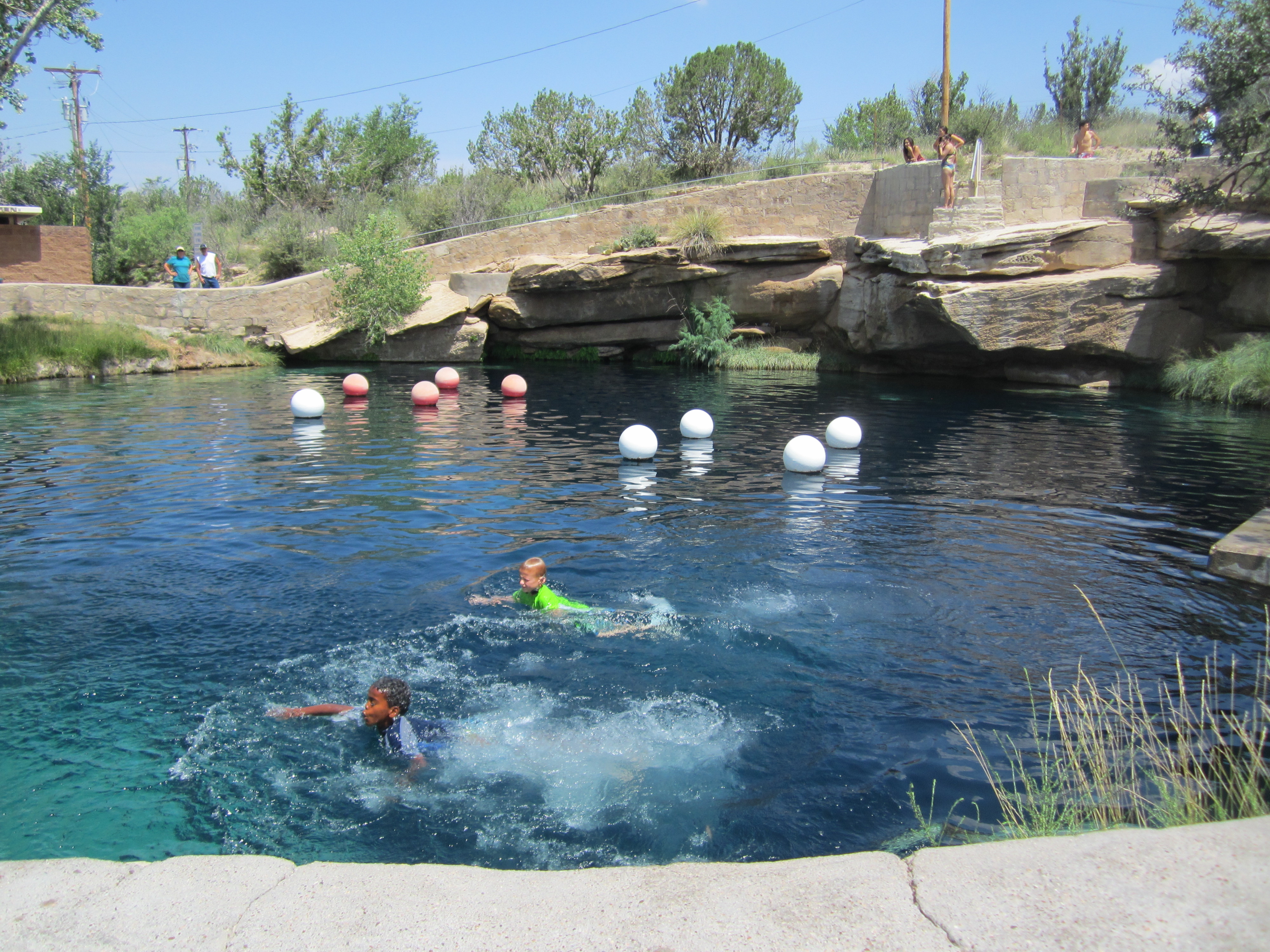 It turned out to be totally worth the detour. Blue Hole is maybe the coolest swimming spot we’ve ever seen. It’s a natural geological phenomenon that is basically just a small but very deep swimming hole surrounded by stone. Specifically, it’s 81 feet deep and stays a constant temperature of around 64 degrees, which is a bit chilly for swimming but on a hot, sunny New Mexico summer day it can be very refreshing. It also is not a stagnant pond but rather is constantly flowing, so the water is extremely clean and clear. And because it’s very deep, it’s also very blue–not the light blue of a Caribbean beach but the deep, rich blue of a sapphire.