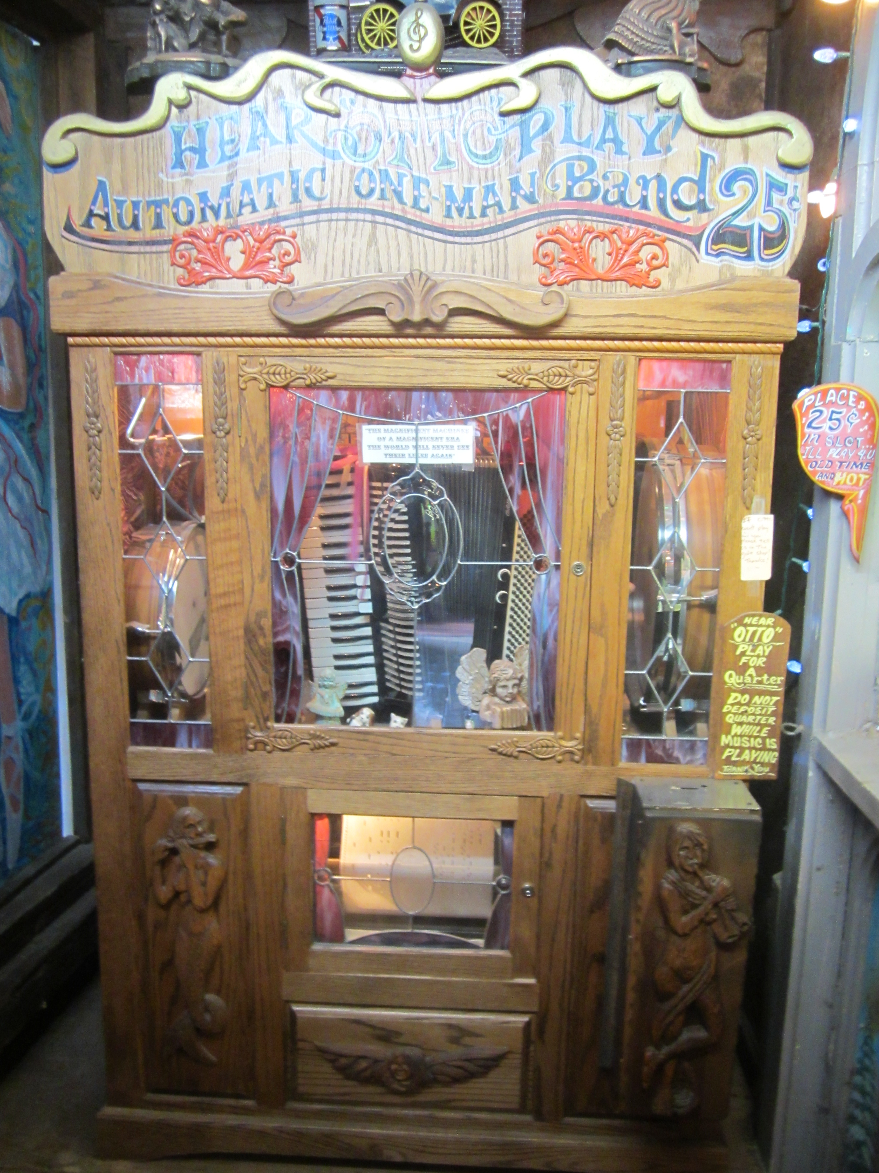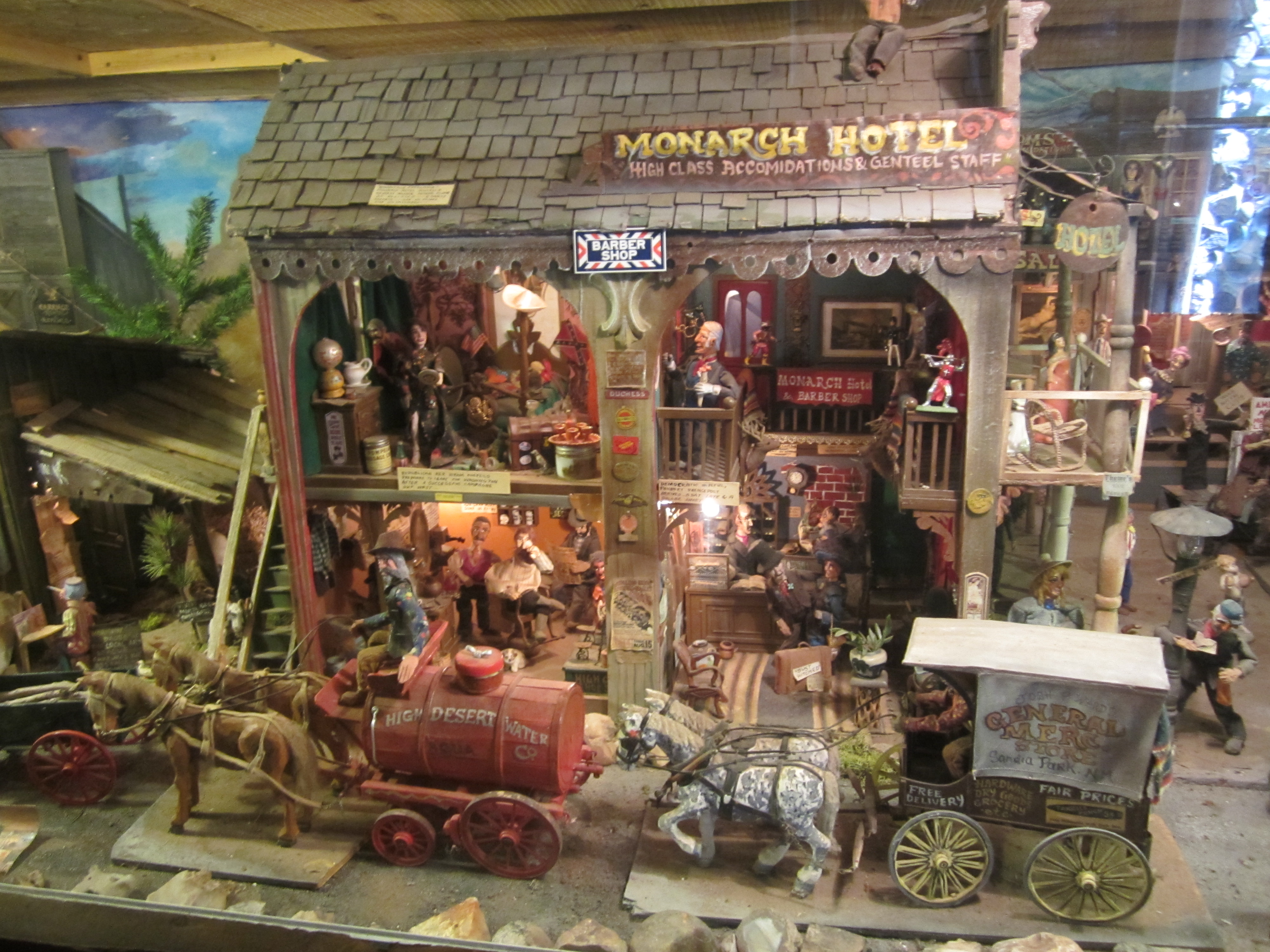 It turned out to be one of the highlights of our trip so far. I’m not sure how to even describe this place adequately. Behind the strange facade at the entrance is a maze of rooms and outdoor walkways of various shapes and sizes. These rooms and walkways are decorated with all sorts of miniature figures and buildings, old license plates, odd signs of all sorts, and wacky stuff like an animatronic band, an old-timey automated fortune-teller, and much more. Some of the miniature figures move if your press buttons. The old-timey machines all work if you drop a quarter into each one, which of course we did. Everything in the place was either made or collected as a hobby (hence the name Tinkertown) by a strange and fun-loving local folk artist named Ross Ward, who died about 15 years ago. My description of the place has just begun to scratch the surface so I’ll shut up now and just show you some photos.