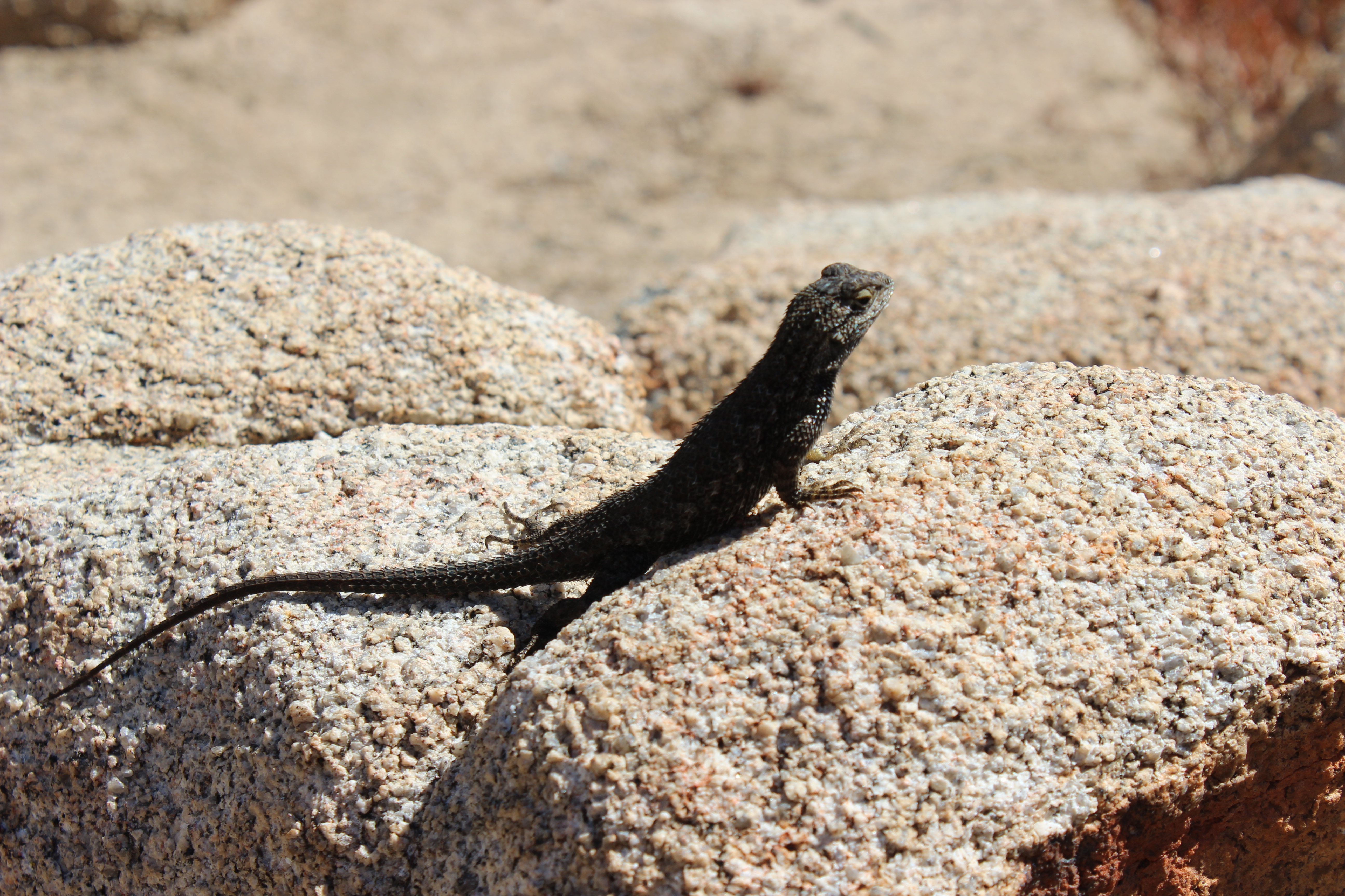 And of course we saw plenty of Joshua trees. But we also saw junipers, kangaroo rats, lizards of various kinds, and cholla cacti, which look soft and furry from a distance but are actually horrendously sharp and painful.