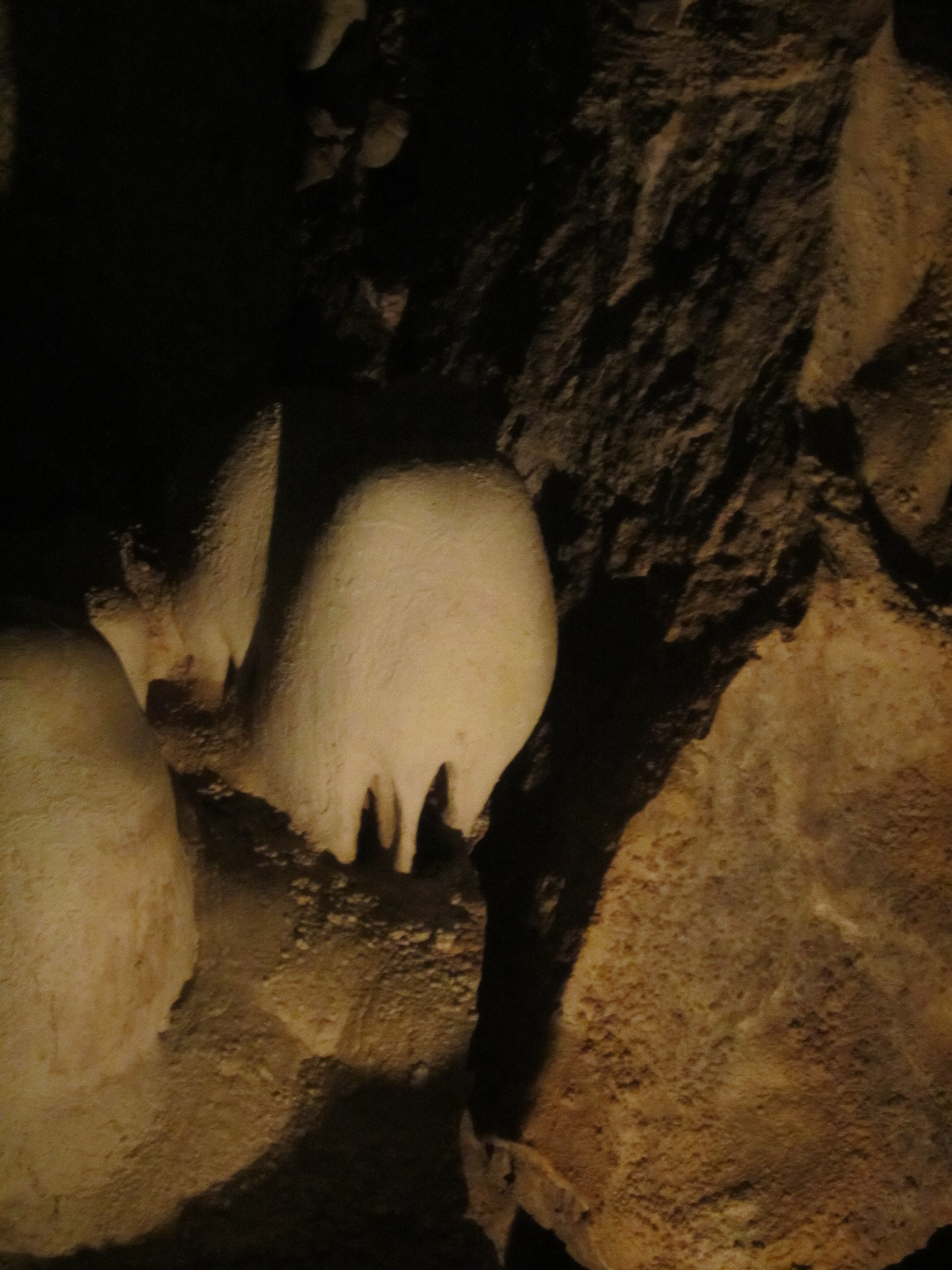 The last major room on the tour, Queen’s Palace, is so named because on each side of the room there are massive stone “draperies” that make the room look rather royal and yes, kind of feminine–for a cave, anyway. The draperies are each about 40 feet tall, which means they took hundreds of thousands of years to form. But from across the room Sam noticed an oddly shaped stalagmite that might have helped give the room its name.