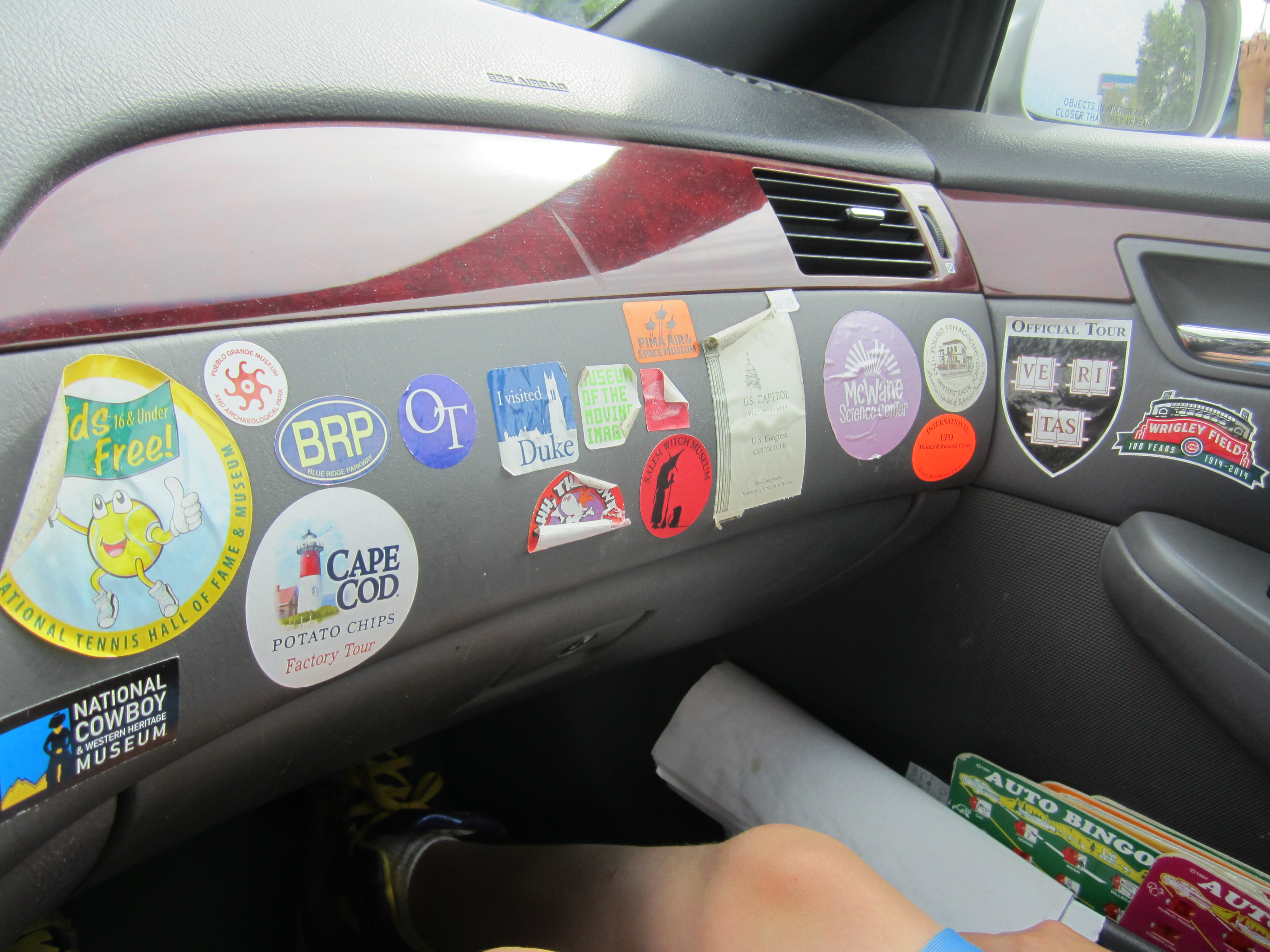 Despite our skepticism we still had fun with all the alien nonsense. We posed with alien cutouts, we made corny jokes about the museum being out of this world, and we shopped for alien souvenirs. And hey, the museum even gave us stickers, so the dashboard in front of Sam’s seat now looks like this: